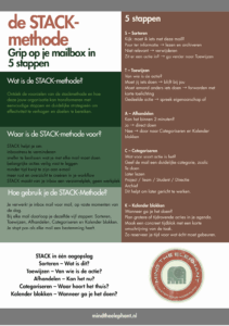 Wil je minder inboxstress en meer grip op je werkdag? De STACK-methode biedt een eenvoudige en direct toepasbare manier om je mailbox op te schonen en belangrijke acties nooit meer te missen. In deze flyer vind je duidelijke uitleg, praktische stappen en een overzicht dat je meteen kunt gebruiken in je dagelijkse workflow. Download de flyer en ervaar hoe je met vijf heldere stappen meer rust, structuur en controle krijgt over je e-mail.